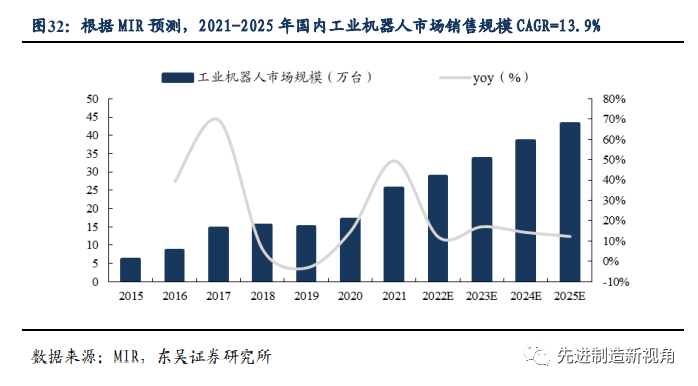 3)政策助推高端制造转型升级。综合来看,根据 MIR 预测至2025 年国内工业机器人市场销量可达 43.2 万台,2021-2025 年 CAGR=13.9%。