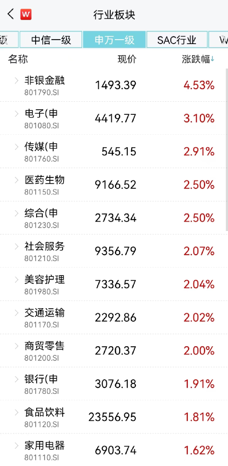 申万一级行业无一下跌,非银金融、电子等板块涨幅达到3%以上。
