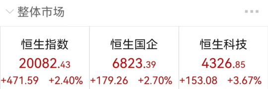 港股三大指数也集体收涨:恒指涨2.40%,指重回2万点;国指、恒生科技指数分别涨2.70%和3.67%。