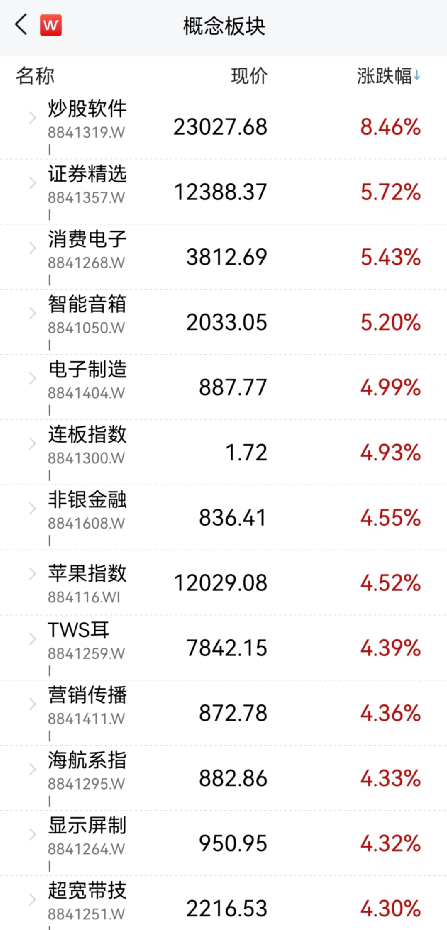 从概念板块来看,因市场交易活跃,炒股软件涨超8%。证券、消费电子、智能音箱等概念指数涨幅居前,均超5%。