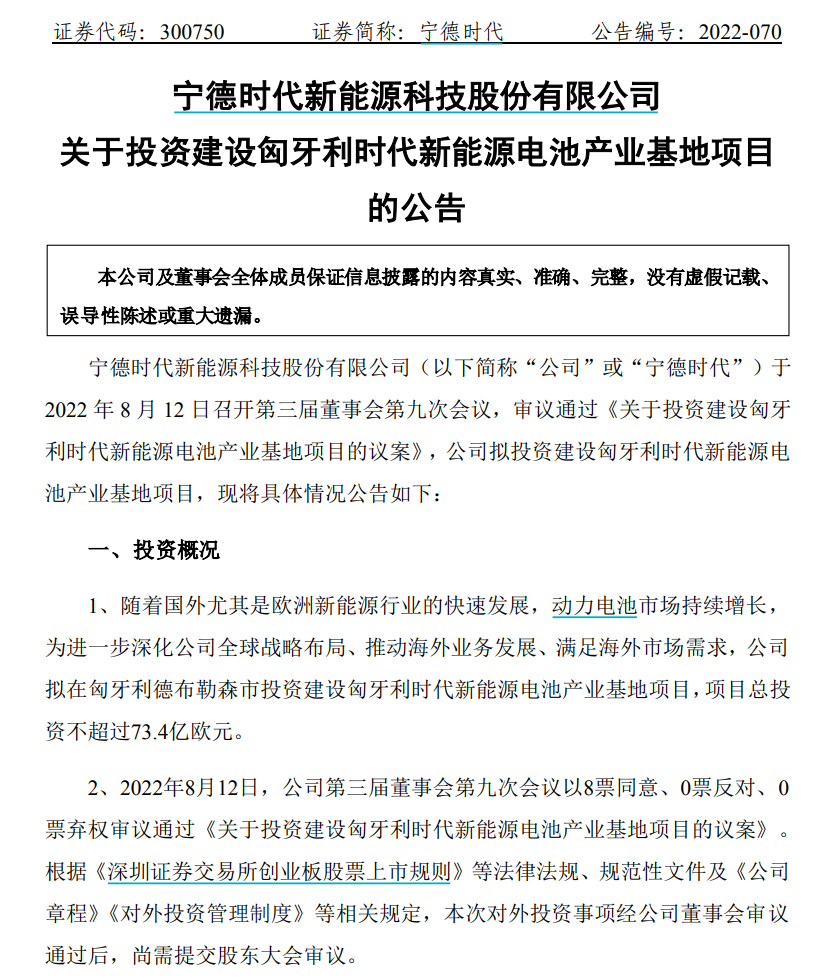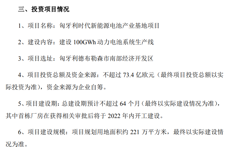 12日盘后,宁德时代公告,公司拟在匈牙利德布勒森市投资建设匈牙利时代新能源电池产业基地项目,项目总投资不超过73.4亿欧元(相当于500亿人民币)