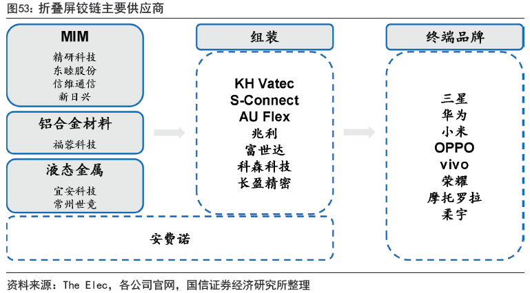 目前折叠屏铰链组装的供应商包括韩国的KH Vatec、S-Connect、AU Flex,中国的精研科技、科森科技、长盈精密、兆利、富世达等。