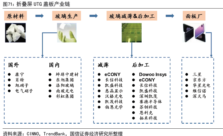 UTG 后道加工厂商有韩国Dowoo Insys、eCONY,中国的长信科技、凯盛科技、凯茂科技、赛德半导体、苏钏科技、恩利克、拓米科技等。