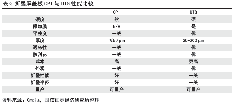 3)UTG:2026年全球市场规模有望达到50亿元, 国内供应链聚焦减薄路线。CPI 和 UTG 是两种主流的折叠屏盖板材料, UTG 在耐刮擦、 硬度、 光学性能、平整度、 外观及触感等具有优势。UTG 生产工艺路线分为一次成形路线(代表企业:肖特/Dowoo Insys)与减薄路线(代表企业:康宁/eCONY), 目前国内UTG 一次成型的技术还处于研发阶段, 产业链相关企业以减薄路线为主。