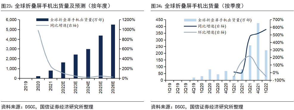根据 DSCC 数据,2021 年全球折叠屏手机出货量 798 万部(YoY: 254%), 预计 2026 年出货量将达到 5468 万部(2021-2026 年 CAGR: 47%), 高增长驱动力来源于: