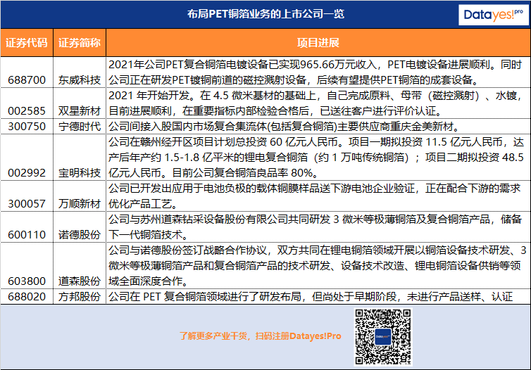 据Datayes!Pro不完全统计,目前A股上市公司中主要有双星新材、宝明科技、宁德时代等布局了PET铜箔产业,具体名单如下: