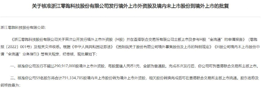 完成本次发行后,零跑可到香港联合交易所主板上市,核准公司59名股东将合计7.91亿股境内未上市股份转为境外上市外资股,相关股份转换完成后可在香港联合交易所主板上市流通。
