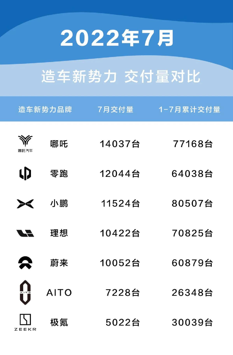 在今年7月,零跑交付量更是已经过万,达到12044辆。其1-7月已经累计交付6.4万辆。值得一提的是,蔚来7月交付只有10051辆,理想交付为10422辆,而小鹏交付量为11524辆,很明显,零跑已将蔚小理甩在身后。