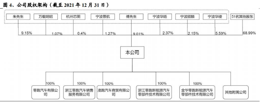 而从股权上看,零跑单一最大股东为朱江明夫妇和大华股份董事长傅利泉夫妇所结成的一致行动人。朱江明夫妇和傅利泉夫妇直接及间接拥有公司约31.01%股权,其余股东拥有公司68.99%的股份。