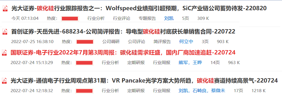 近期具有代表性的碳化硅研报,期标题对于碳化硅的整体评价程度是很高的,要不就是长订单,需求旺盛,要不就是高景气的赛道。俨然一副新能源赛道的描述,可见券商对碳化硅的看好。