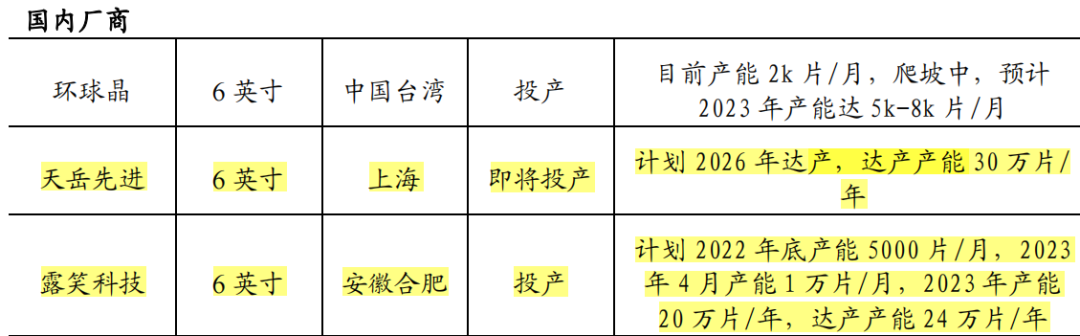 露笑科技是国内最早研发 6 英寸SiC晶圆的单位之一,已掌握碳化硅单晶晶体生长、切割、研磨、抛光、清洗等整体解决技术和工艺方案。预计年底产能达 5000 片/月,2023 年产能达 20 万片/年。