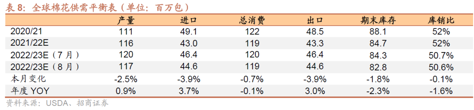棉花方面,招商证券表示,8月USDA报告调减2022/23年全球棉花消费预期83万包,主要是因为美国、巴基斯坦、对应需求缺口约208万包。
