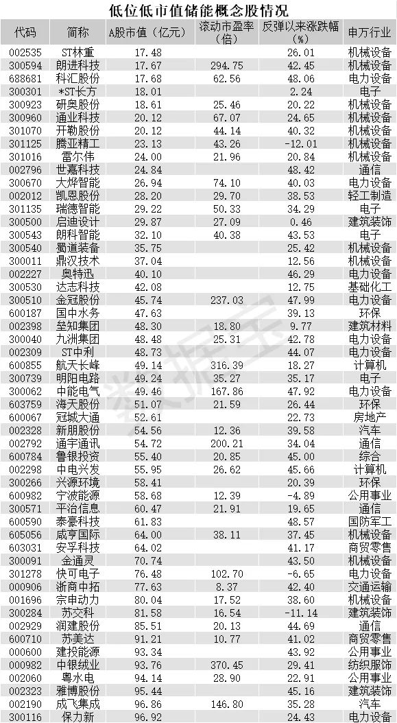 相对而言,股价尚处低位的小市值储能概念或许弹性更大。数据宝统计,本轮反弹涨幅不足50%且市值不足100亿元的储能概念股合计共有50多只。从市值角度看,ST林重、科汇股份、朗进科技等个股市值均不足20亿元。