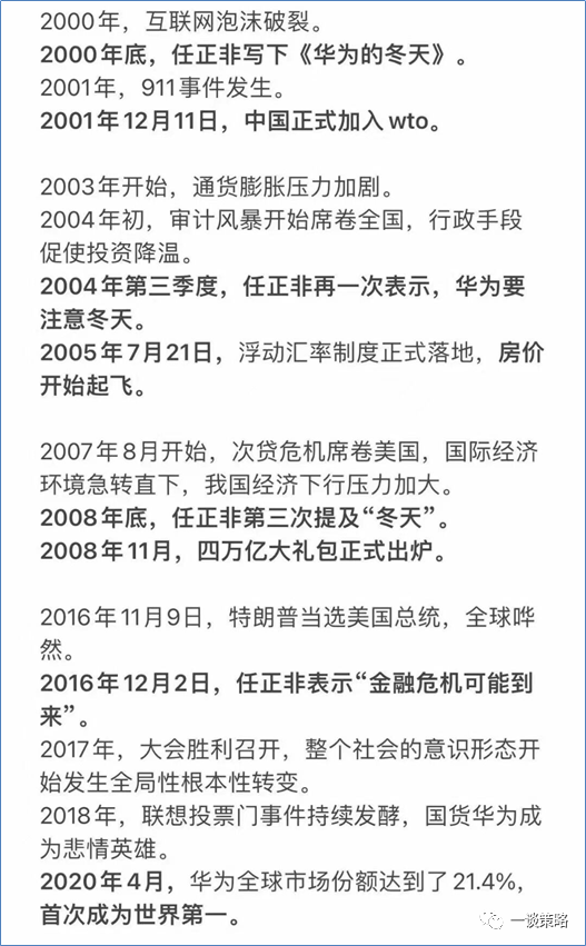网上有人整理了任总过去二十年的悲观看法,多次提及类似“活下去”的警告,但事后看,华为越活越好,中国经济也蒸蒸日上。(详见下图,具体真伪没考证)