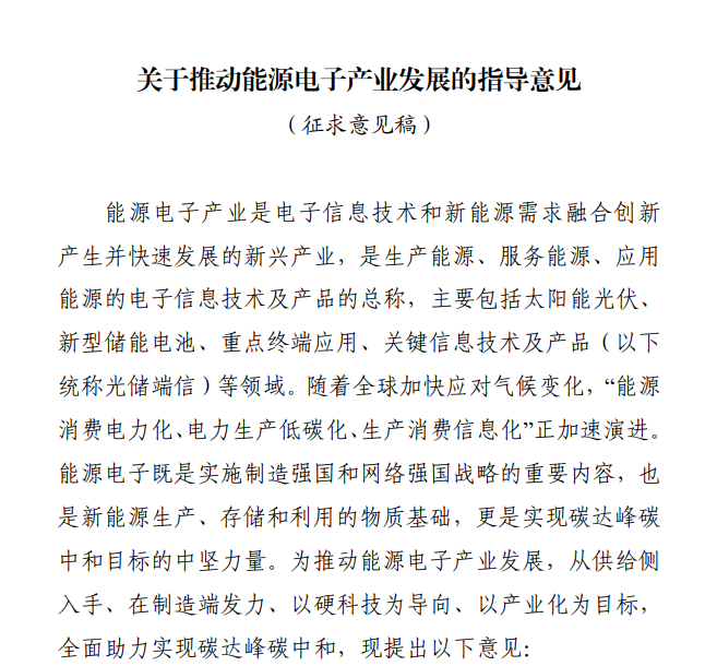 工信部发布《关于推动能源电子产业发展的指导意见(征求意见稿)》(下称《意见》)提出,推动能源电子产业发展,全面助力实现碳达峰碳中和。