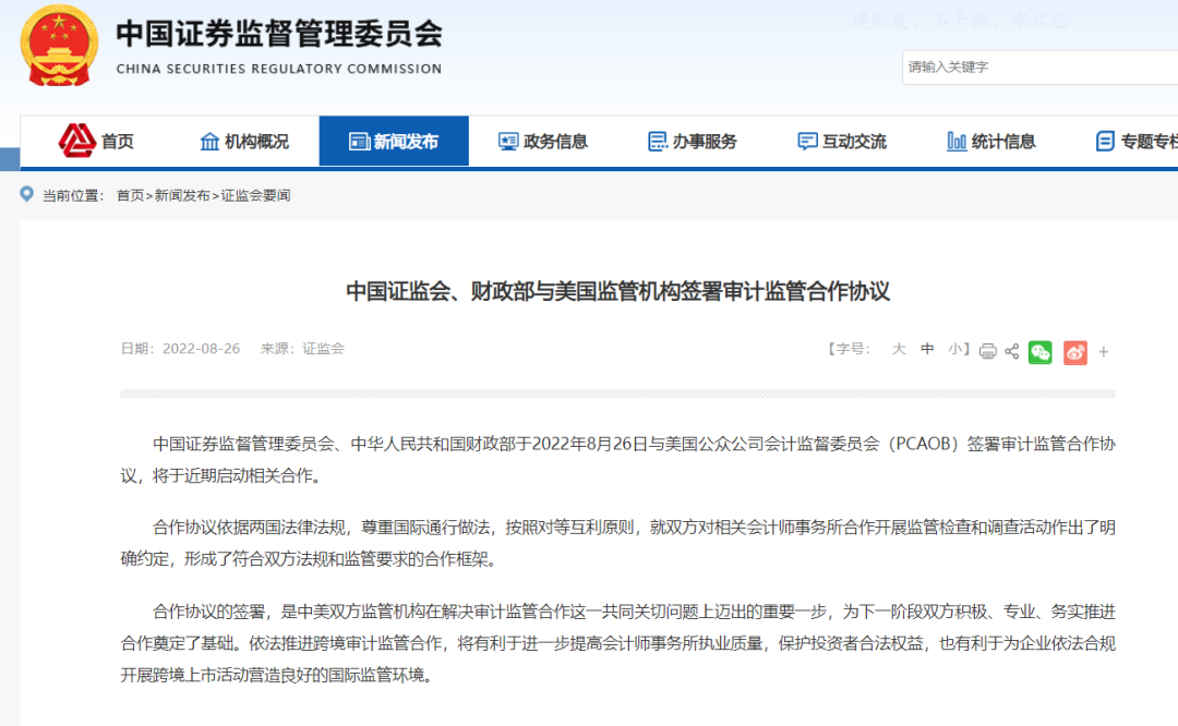中国证券监督管理委员会、中华人民共和国财政部于2022年8月26日与美国公众公司会计监督委员会(PCAOB)签署审计监管合作协议,将于近期启动相关合作。