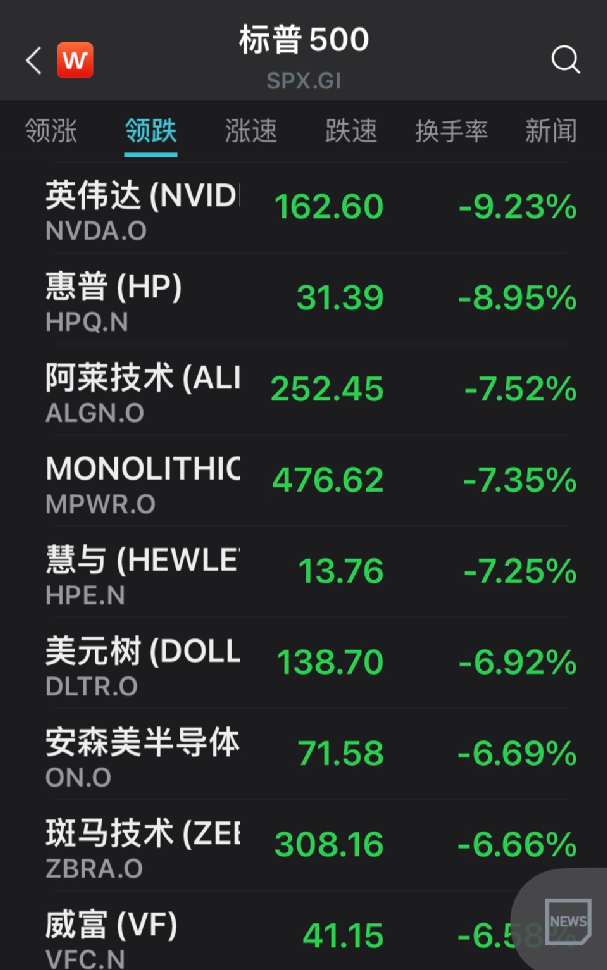 纳斯达克100指数成分股普遍收跌,芯片股英伟达跌9.23%领跌、迈威尔科技跌8.93%、微芯科技跌6.55%、AMD跌6.17%、恩智浦跌6.09%、应用材料跌5.90%、美光科技跌5.83%,医疗器械公司艾利科技(ALGN)跌7.52%,零售折扣店Dollar Tree跌6.92%,Workday则涨2.53%,艺电涨3.57%。
