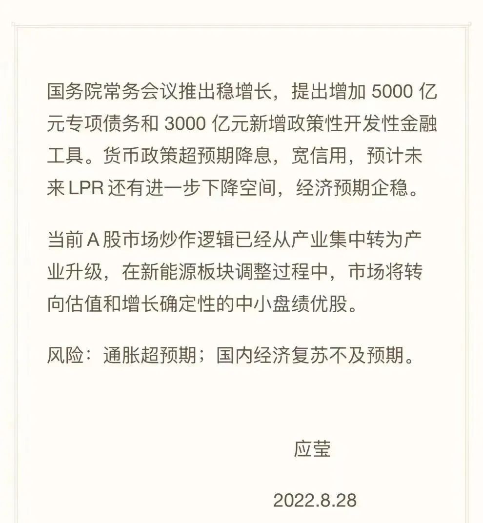 短期来看,随着重要会议窗口期临近,粮食、能源与信息安全仍将是市场关注核心,重点关注短期业绩拐点、长期转型预期的火电,四季度仍有较大供需缺口的农业,以及政策趋势确定的信创产业;另外一方面,欧洲经济风险上升,关注受益于“欧洲替代”的铝、锌、维生素、化肥农药、钛白粉等细分行业的投资机会。从中期来看,通胀依然是全年最重要的投资主线,持续关注受益于通胀上行的农业,业绩稳健的食品饮料,家电和医药等消费行业龙头,以及虚拟现实,游戏等泛消费概念。