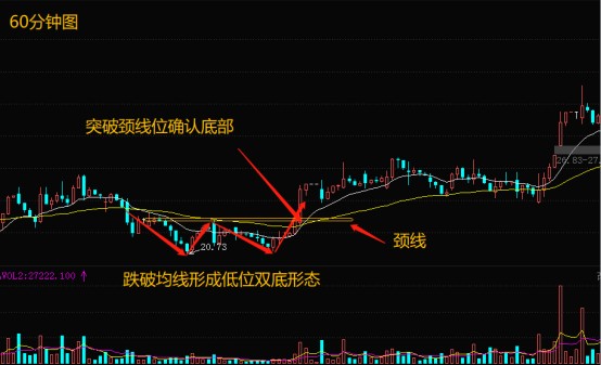 股价弱势盘整,跌破短期均线后在低位形成双底形态,随后股价均匀放量并站稳颈线位,确认短期底部形成,果断抄底等待主力拉升。