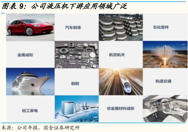 公司自主研制的全自动汽车冲压生产线、直接热成形生产线、间接热成形生产线、精密温锻造液压机、双动充液拉深液压机等产品均为国际领先产品,下游应用于汽车、航空航天、军工、船舶、轨交等多个领域。