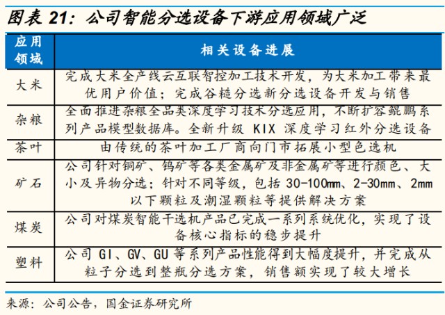 公司智能分选设备可以用于大米、杂粮、茶叶、矿石、煤炭等多个领域,近年来先后推出红外、X射线异物检测机,继续提高检测精度,可检测分选出食品中混入的恶性杂质和异物,设备下游应用有望不断拓展,稳居行业第一梯队。