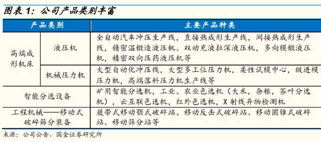 研报菌简评:公司产品品类丰富,涵盖工程机械—移动式破碎筛分装备、智能分选设备、高端成形机床等。