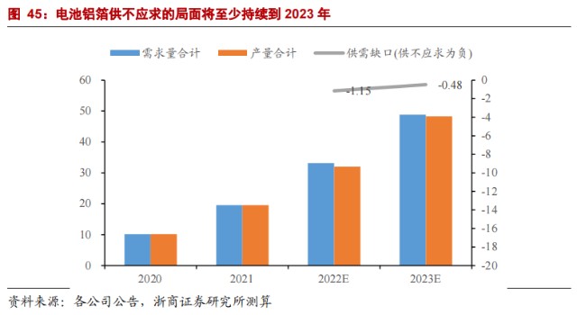 电池铝箔生产工艺难度较高,扩产周期长,供给端产线放量不易。一般而言,电池铝箔扩产设备购买交付需要14-16个月、设备安装调试及产线建设需要4-6个月、下游客户认证还要6个月以上。因此,整体产线扩产周期至少要2-3年。产线建设周期长、爬坡放量难度大,供需扩产速度不一致,机构判断电池铝箔错配周期将进一步拉长,预计未来1-2年将维持紧平衡状态,整体供需紧张局面短期内预计难以缓解。