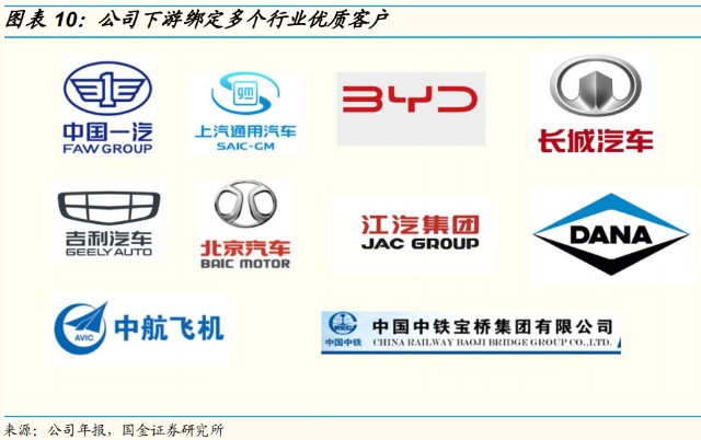 公司客户资源优质,绑定多个行业头部客户,凭借优质的产品性能,汽车产品应用下游多个环节,提供定制化产品。在传统汽车领域,已为比亚迪、长城、吉利等多家厂商供货成套冲压生产线。