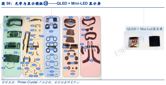 Pimax Crystal的光学与显示模组由QLED + Mini-LED 显示屏、镜筒、Crystal Lens-35PPD透镜、三对透镜支架、IR LED盖板、包布支架、螺杆支架、Auto-IPD 螺杆、小压片构成。其中的QLED + Mini-LED显示屏结合了OLED与Mini-LED两方的优势,非常适合应用于VR。