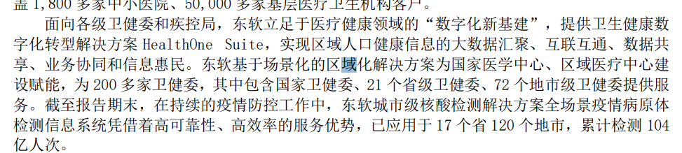 其半年报提到,基于场景化的区域化解决方案为国家医学中心、区域医疗中心建 设赋能,为 200 多家卫健委,其中包含国家卫健委、21 个省级卫健委、72 个地市级卫健委提供服务。截至报告期末,在持续的疫情防控工作中,东软城市级核酸检测解决方案全场景疫情病原体检测信息系统凭借着高可靠性、高效率的服务优势,已应用于 17 个省 120 个地市,累计检测 104 亿人次。