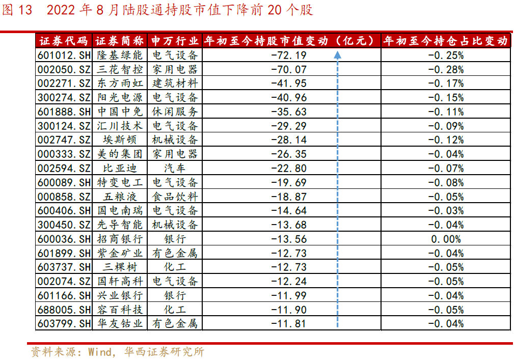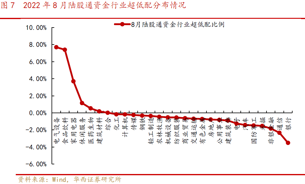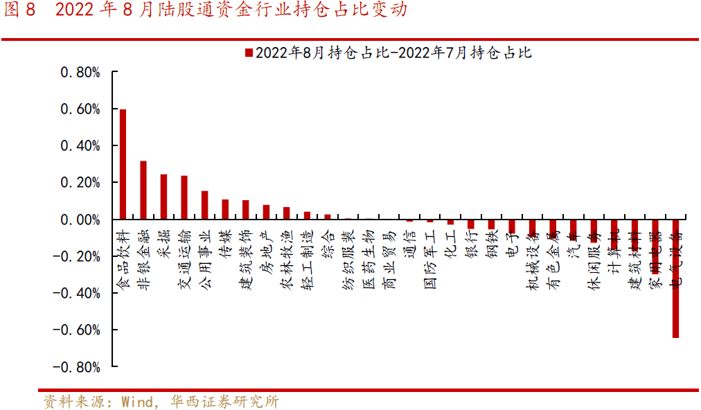 从持仓占比变动来看,8月陆股通主要加仓“食品饮料(0.60%)、非银金融(0.32%)、采掘(0.24%)”,主要减仓“电气设备(-0.64%)、家用电器(-0.30%)、建筑材料(-0.17%)”。