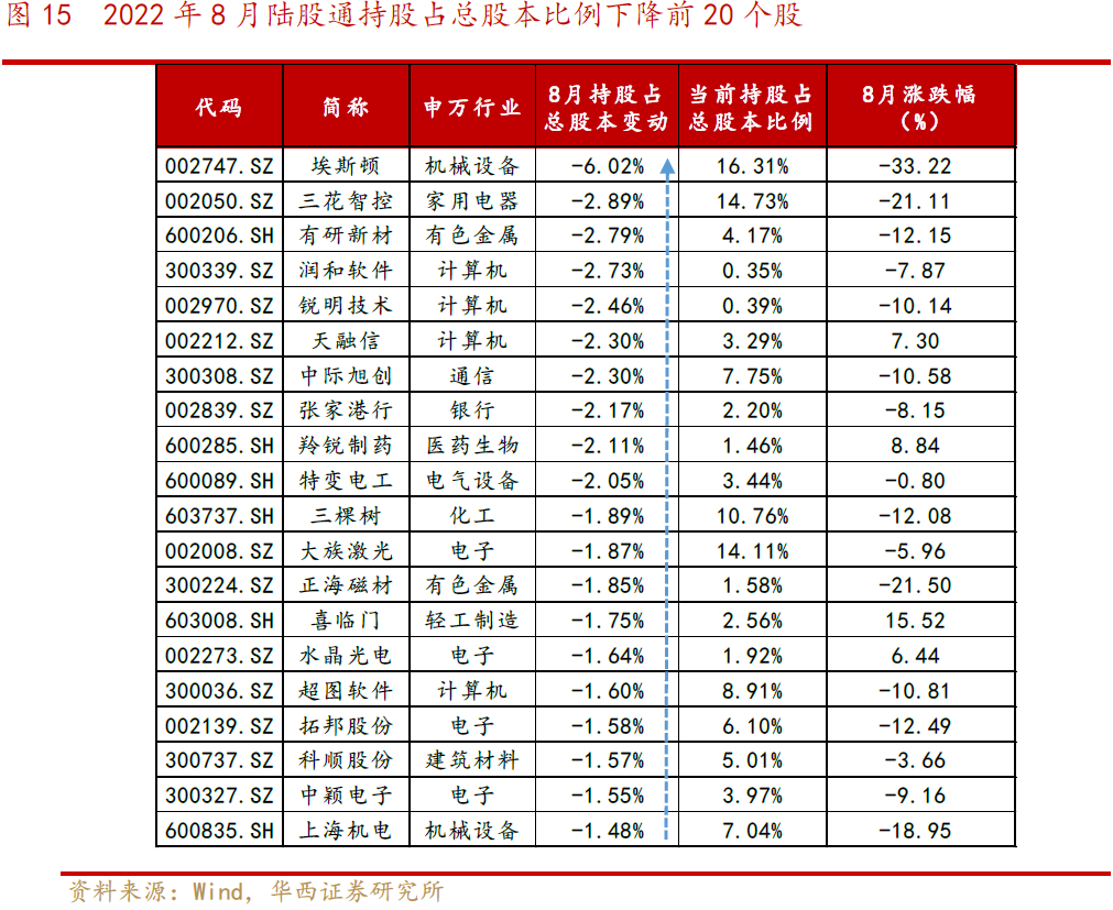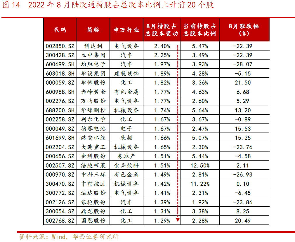 8月陆股通资金主要增持了“科达利、立中集团、均胜电子、华设集团、华锦股份”等个股,增持股份占其总股本比重分别为2.40%、2.25%、1.97%、1.89%、1.82%;主要减持了“埃斯顿、三花智控、有研新材、润和软件、锐明技术”等个股,减持股份占其总股本比重分别为6.02%、2.89%、2.79%、2.73%、2.46%。