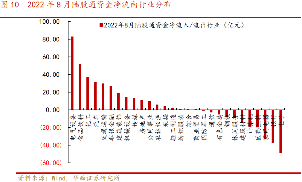 8月陆股通资金主要净流入“电气设备、食品饮料、化工”等行业,净流出“电子、银行、家用电器”等行业。