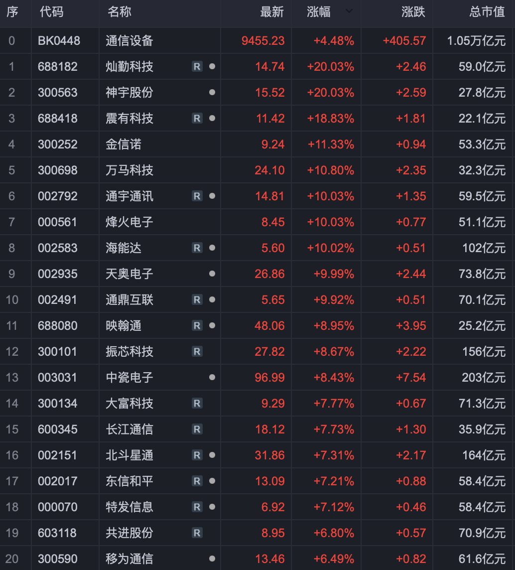 上周五,卫星通信概念股集体飙涨。截止收盘,神宇股份20CM涨停,华力创通、欧比特涨超16%,国科微、金信诺、康拓红外等涨超10%,波导股份、合众思壮、烽火电子、上海沪工、中国卫通、海能达、中国卫星、天奥电子、云鼎科技等多股涨停。