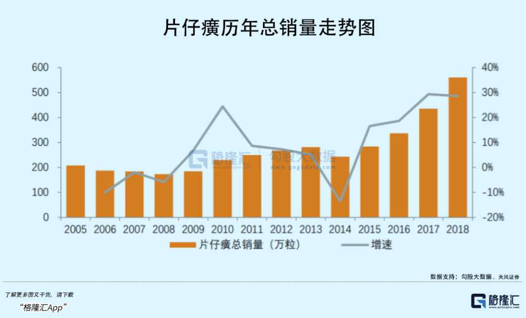 从公司销量层面来看,2005-2014年,片仔癀年销量范围仅为170-280万粒,2005-2013年复合增速仅为3.8%。可见这10年很明显受到天然麝香供应不足的影响。而从2016年开始,片仔癀开始放量,到去年总规模预估有1000万粒左右。