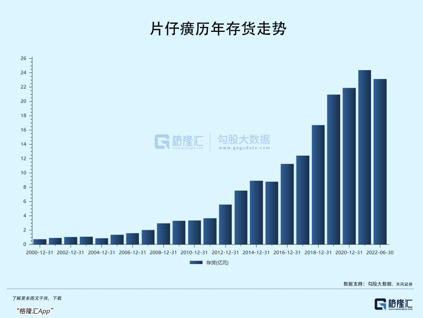 从另外的层面看,片仔癀存货显著增加。从2015年的8.78亿元增加至去年末的24.4亿元,足足增长了将近200%。
