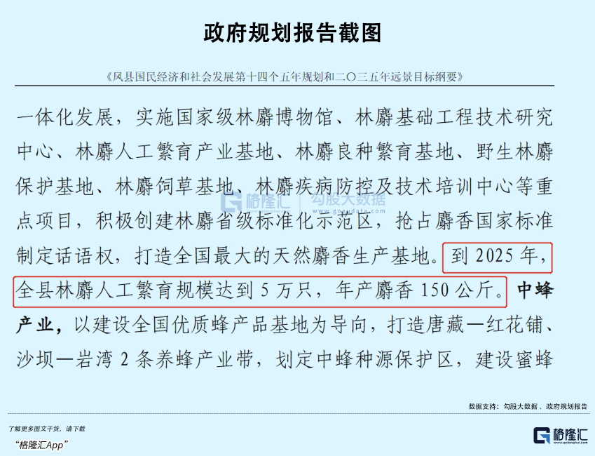 之前山西凤县规划林麝的养殖规模在2027年达到5万头。但实际情况,可能会大幅提前。据宝鸡市林业局6月新闻数据披露,目前养殖林麝存栏2.2万头。又根据去年凤县“十四五”规划,到2025年林麝的养殖规模将会达到5万头。