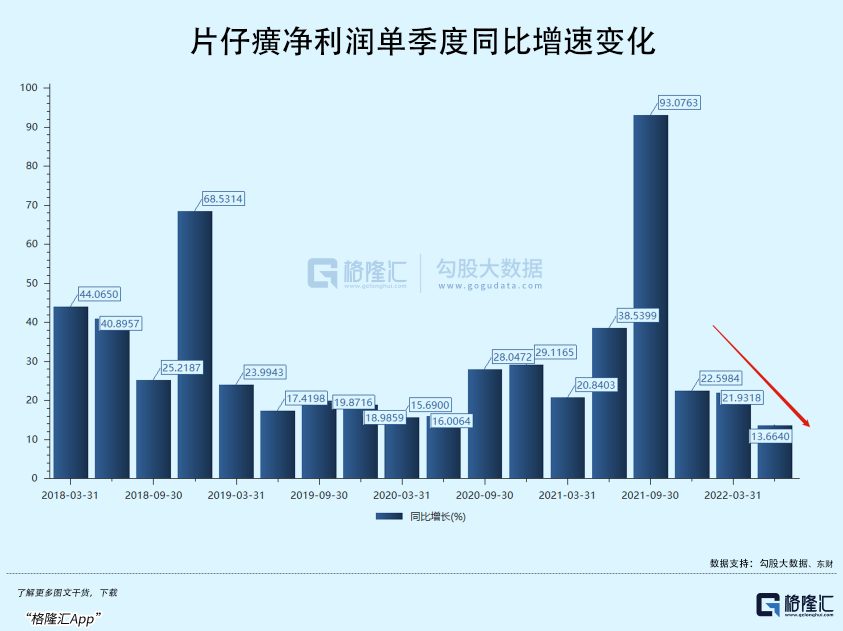 21Q3-22Q2,销售收入同比增速分别为45.2%,133%,19.7%,10.2%。据国盛证券分析,国内片仔癀Q2业务收入约为6.3亿元,同比下滑6.4%,境外收入为2.3亿元,同比大增113%。