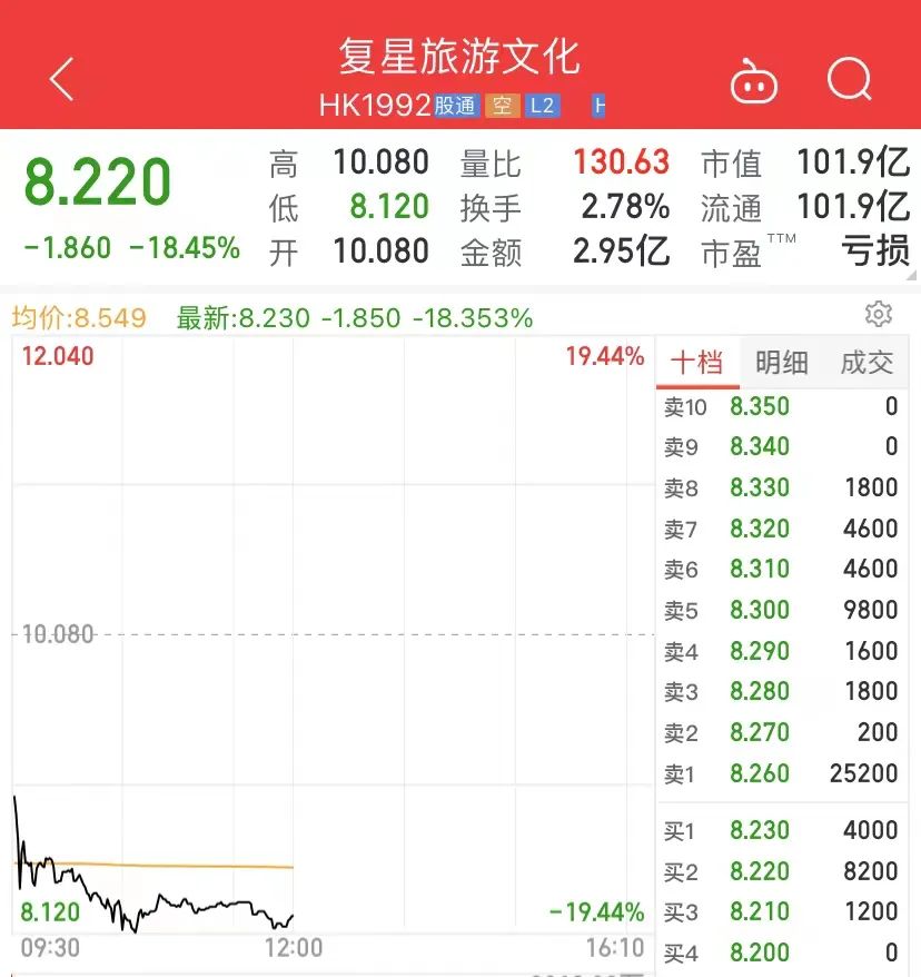 有人欢喜有人忧。昨天复星医药跌停过后,今天又轮到复星旅游文化,开盘直线跳水,盘中一度跌超19%。