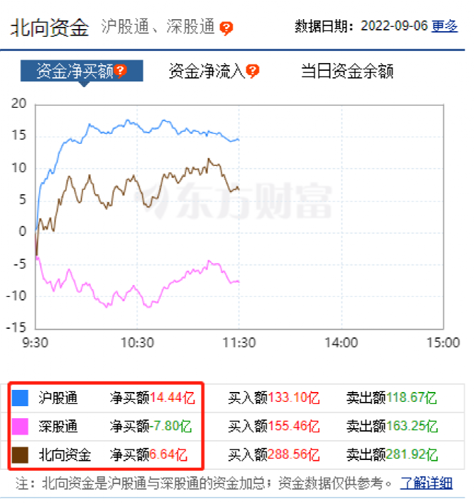 北上资金上午净买入超6亿元,沪股通净买入超14亿元,深股通净卖出近8亿元。