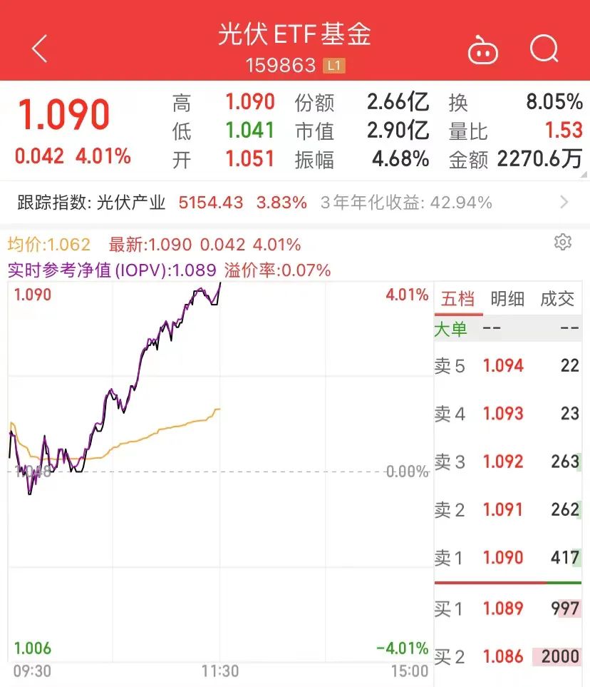 上午10点半过后,市场突然开始拉升,尤其光伏板块走势强劲。光伏ETF基金狂拉超4%。