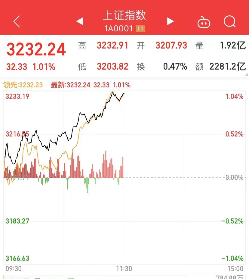 盘中强力拉升后,上午收盘,上证指数大涨1.01%,深证成指涨0.65%,创业板指数微跌0.2%,科创50指数涨1.04%,个股普涨,3258只上涨,1433只下跌,成交额5301亿元,较昨日上午增加303亿元。