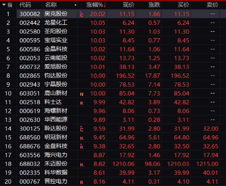 8.7万亿市值的光伏板块掀起涨停潮。奥克股份20cm涨停,龙星化工、圣阳股份、宝塔实业、金晶科技等掀起涨停潮。