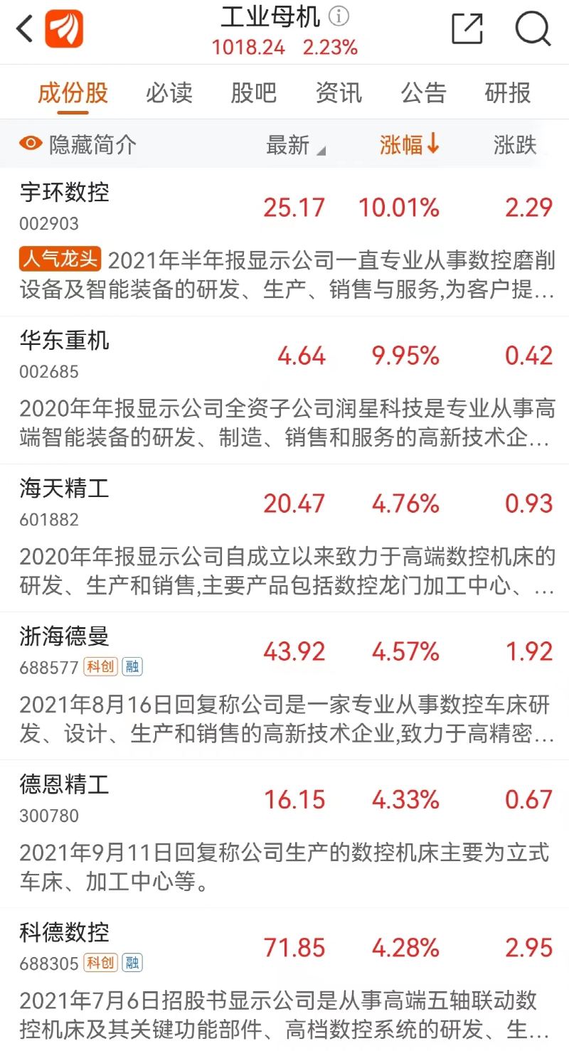 受到这一消息刺激,9月7日上午,工业母机概念板块持续走强,宇环数控、华东重机涨停,明志科技涨超17%,东土科技涨超14%,华中数控、科德数控、禾川科技等跟涨。