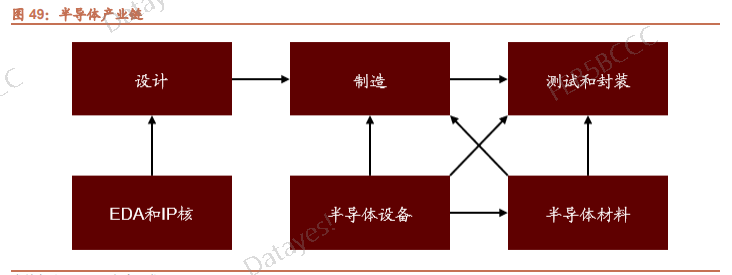 芯片制造的主供应链分为“设计-制造-封装”三个环节,辅产业链还包括用于芯片设计的EDA软件与IP核、半导体设备与半导体材料。