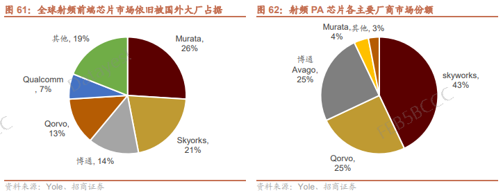 全球射频前端芯片市场目前仍主要被美日厂商垄断,有组21年的数据显示,射频前端市场85%的份额被Skyworks、村田、Qualcomm、Qorvo和Broadcom在内的五家厂商占据。