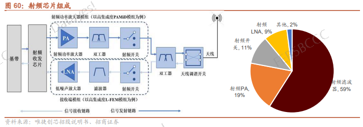 从组成来讲,一个射频芯片包括RF收发机、功率放大器、低噪声放大器、滤波器等组成部分。其中在射频前端芯片中,滤波器、功率放大器、射频开关、低噪声放大器等2020年的全球市场总份额超过95%。