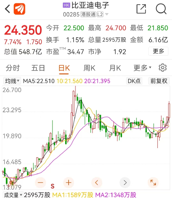 9月7日,比亚迪电子(0285.HK)官方发布消息,公司是华为Mate50 Pro金属中框、玻璃后盖及摄像头装饰件的主力供应商。7日当天下午,其股价便产生异动,一度加速上涨超9%。收涨7.74%报24.35港元,创7月以来新高。