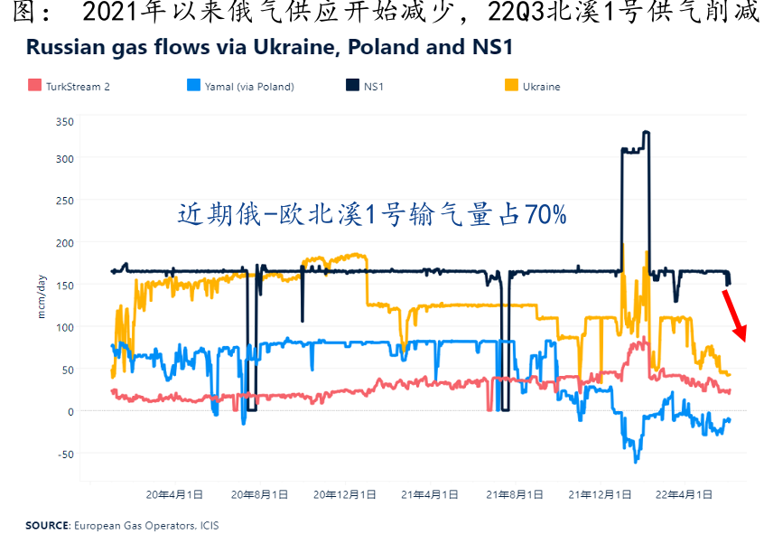 自俄乌冲突以来,俄气对北溪1号供气量就较往年正常水平已大幅下降,6月份从1.5亿方/天减到6000万方/天,7月底北溪1号从6000万方/天减到3000万方/天。