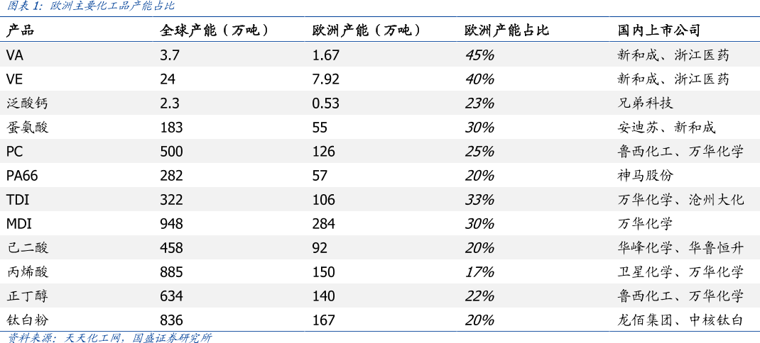 当前欧洲产能占比较高的品种有维生素、蛋氨酸、MDI、TDI等,这些类的化工品就会在大环境下因为成本上涨而涨价,甚至供应还会下滑。